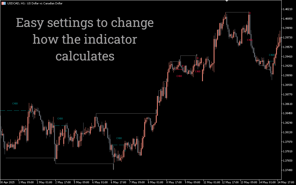 Detect bullish and bearish delivery shifts with Change in State of Delivery (CISD) for MT5. Spot trend changes and reversals using LuxAlgo’s smart swing detection.