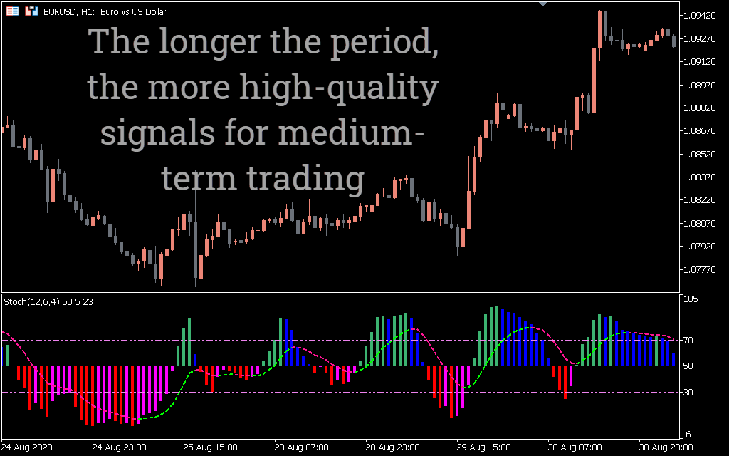 Here is the setup for entering a short position, confirmed by the green Color Stochastic mark when entering the overbought zone. Wait for the bearish candle to close and then enter. Place your stop loss just above the high of the bearish candle. Exit with a profit at the next support level or wait for the indicator to reach the oversold area.