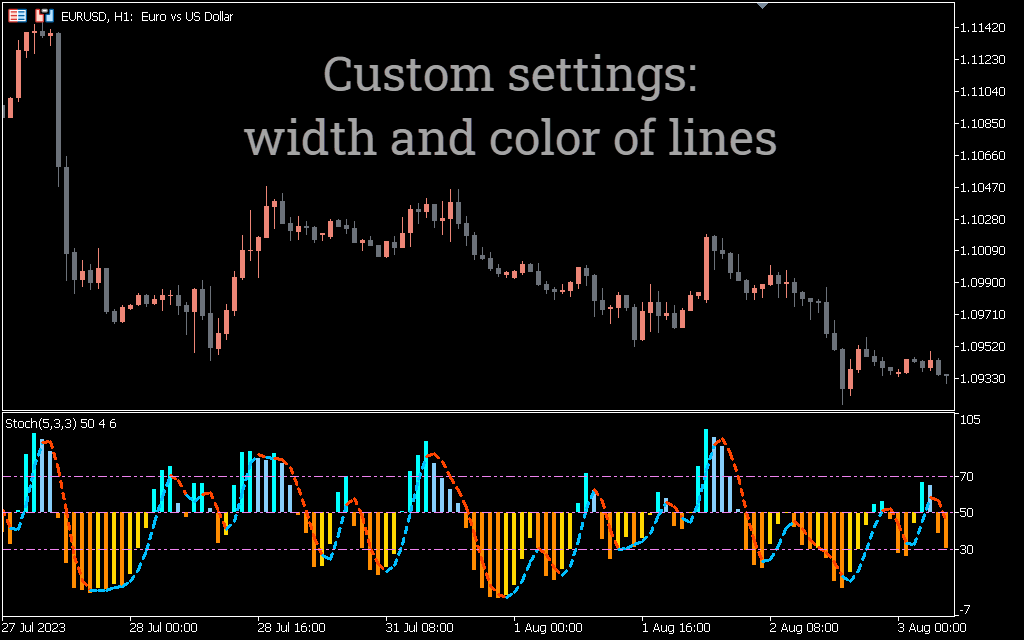 Stochastic “Color” works in the same way as the stochastic oscillator, but with a slight modification. It functions as a momentum indicator that compares a particular closing price of a financial asset to its price range over a specific period of time.