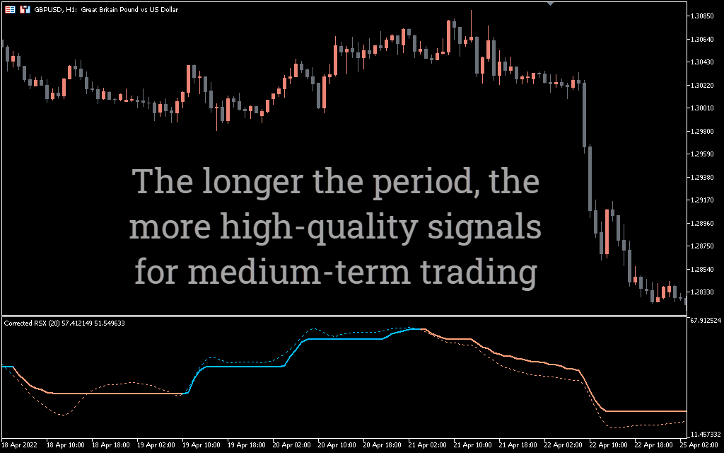 Corrected RSX is a suitable indicator for trading with the trend. The Corrected RSX indicator provides traders with ideal trade entry points. Perfect trend reversal detector.
