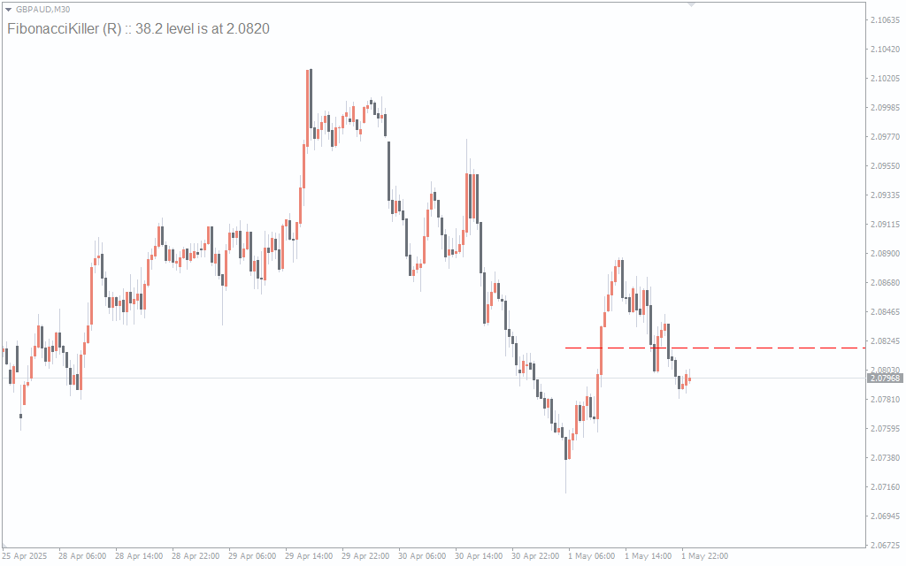 The indicator detects and plots Fibonacci retracement levels dynamically, based on recent price swings. When price approaches a major retracement level like 38.2% or 61.8%, the indicator can trigger an alert, signaling a potential reversal or continuation. Traders typically use this information to either enter in the direction of the trend during a retracement or exit positions when nearing a resistance or support level. The tool is especially effective when combined with candlestick confirmation or volume analysis.