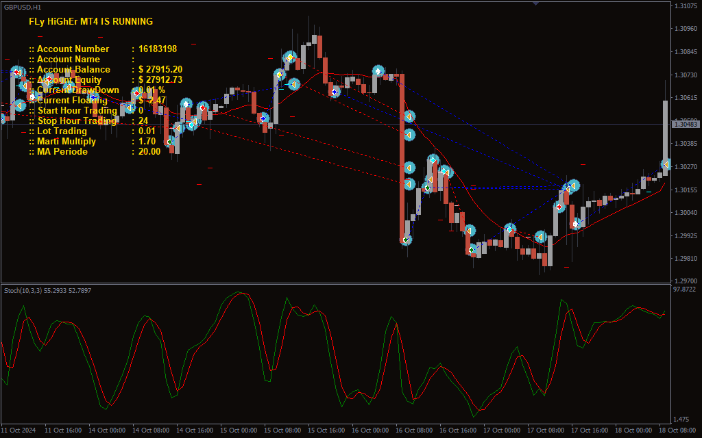 Fly Higher EA leverages a multi-layered approach combining trend-following logic and counter-trend strategies. The core methodology relies on moving average crossovers to identify trend directions while stochastic oscillators are used to pinpoint overbought and oversold zones. The EA enters trades when specific confluences align, maximizing the potential for profitable outcomes. Additionally, the EA integrates a Martingale-like lot sizing strategy to recover from drawdowns, allowing it to maintain profitability even after a series of losses. However, this approach requires careful risk management, as aggressive lot multiplication can lead to significant exposure during extended losing streaks.