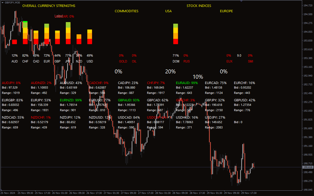 The Forex Dashboard Full Indicator provides real-time trading signals by monitoring various aspects of the market. It displays the strength of major currencies in percentages, making it easy to spot trends and reversals. Bullish or bearish conditions are indicated visually, helping traders interpret market sentiment quickly. Additionally, the indicator tracks the performance of commodities like gold and oil, providing valuable insights into their influence on forex markets. Stock indices such as Dow and DAX are also monitored, giving traders a global market perspective and helping them align their strategies accordingly. The intuitive design ensures that all critical information is accessible at a glance, allowing traders to identify entry and exit points effectively.