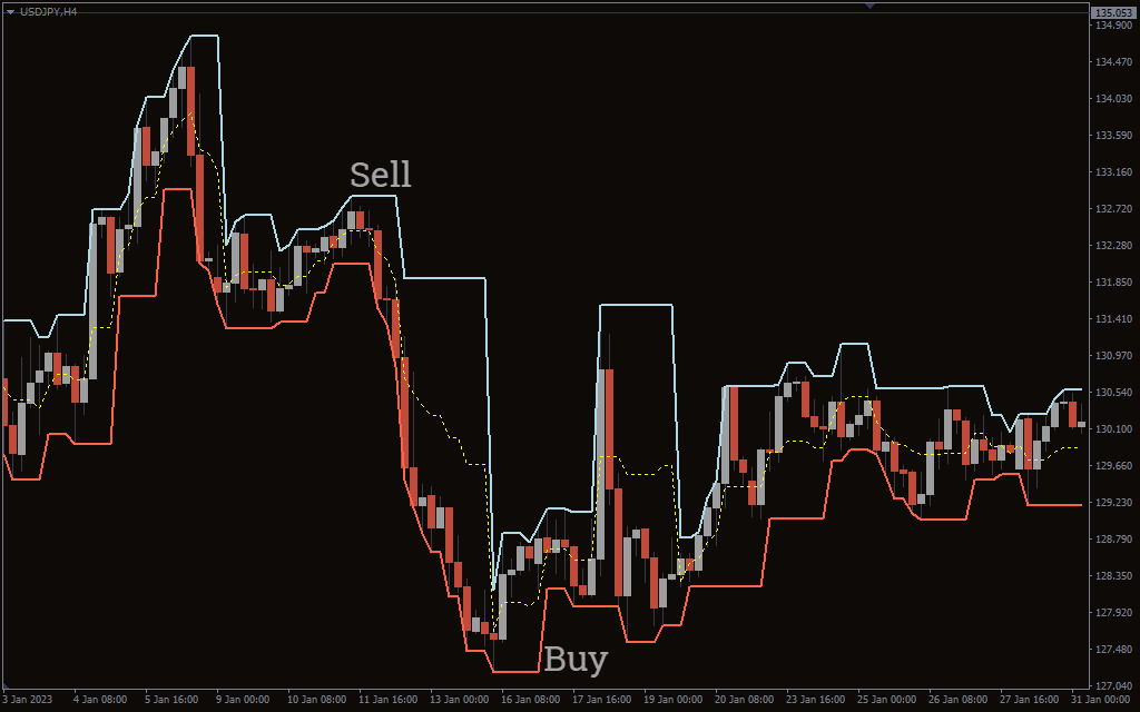 The above USD/JPY H4 chart shows the Fractal Channel Indicator BUY and SELL signals.