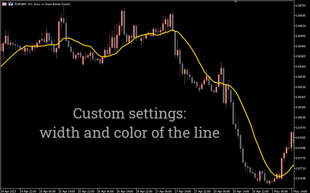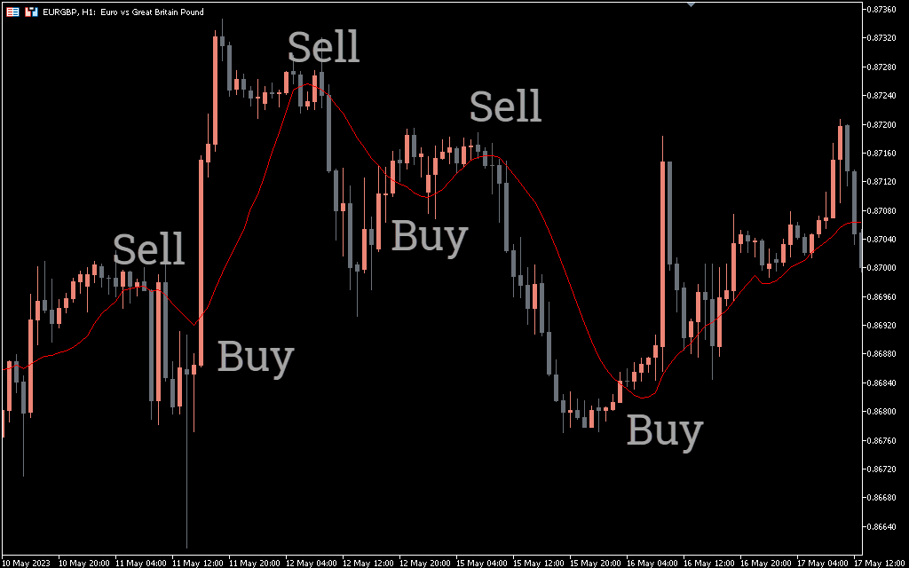If the price crosses the red line upward, it indicates a bearish trend in the market. Therefore, forex traders should enter the market with a buy trade using a stop loss below the previous swing low. Likewise, if the red line crosses down the price chart, it indicates a bullish trend.