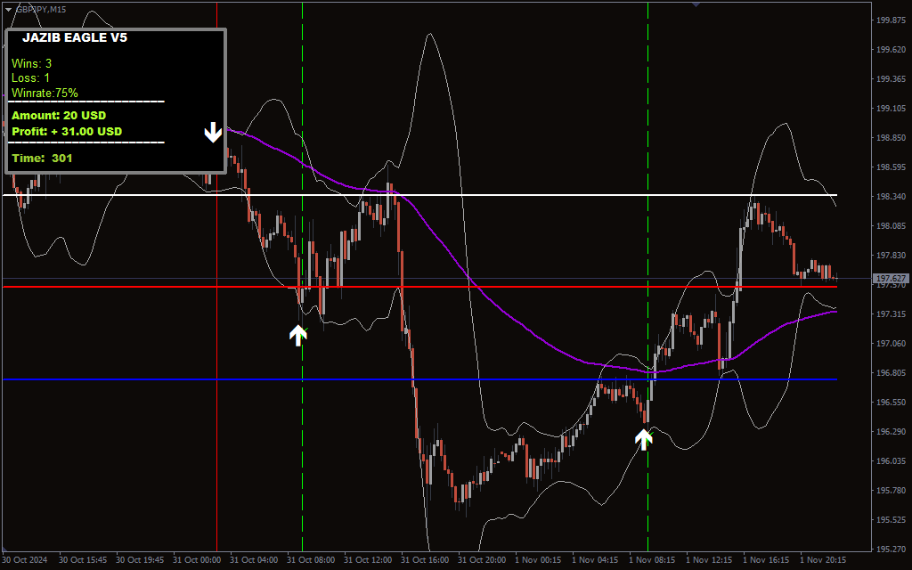 The Jazib Eagle V5 Indicator generates trading signals through visible buy and sell arrows on the chart. A white up arrow indicates a buy signal, suggesting a potential upward movement, while a down arrow signals a sell, indicating a possible price decrease. These signals are displayed alongside Bollinger Bands, support, and resistance levels, which provide additional context to the trading decision.
