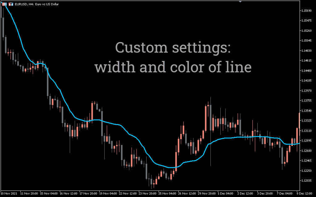 The above EURUSD H4 candlestick chart shows the KAMA indicator for MT5 in action. The indicator shows the KAMA line on the chart in RED. Forex traders can apply the indicator line and price crossing trading strategy. In addition, traders can use the crossover of several indicators using slow and fast KAMA. However, the latter option is not preferable, as it gives pending trading signals.