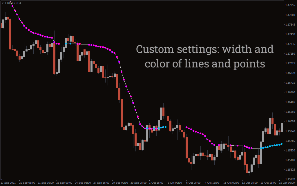 The Kaufman Adaptive Moving Average Indicator for MT4 is a simple MT4 indicator that plots MA on the chart. By drawing red and blue dots, the indicator shows the trend’s direction. In addition, you can download the indicator for free from our website.
