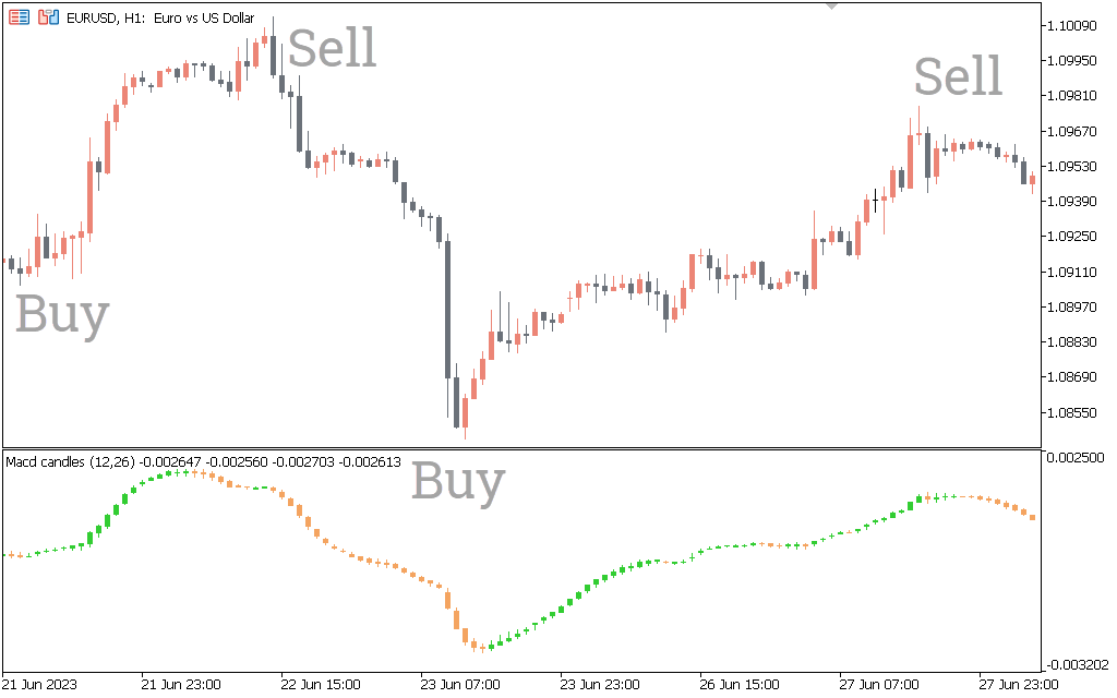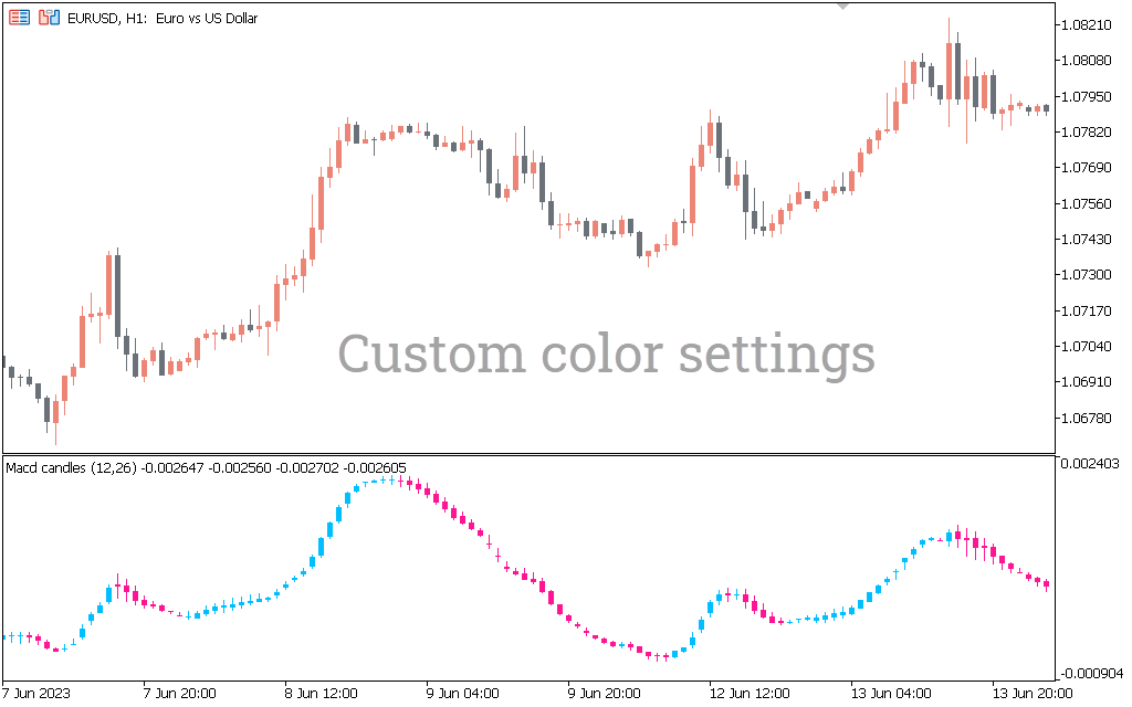 MACD Candles Indicator for MT5 displays the bullish and bearish price trend of multiple forex currency pair charts on the current chart.