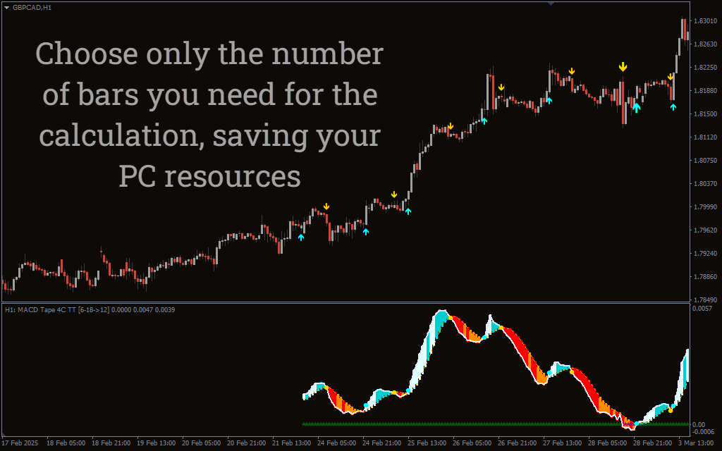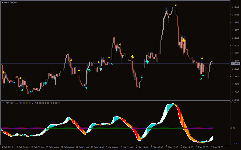 The MACD Tape Indicator generates signals based on the momentum of the market. When the histogram bars change color from red to cyan or turquoise, it suggests a potential bullish trend shift, indicating buying pressure. Conversely, when the bars turn red or orange, it signals a potential bearish reversal, suggesting selling pressure. Additionally, arrows on the chart help traders confirm entries and exits by marking potential trend changes. This indicator is most effective when used alongside support and resistance levels, trend lines, and other technical tools to filter out false signals.