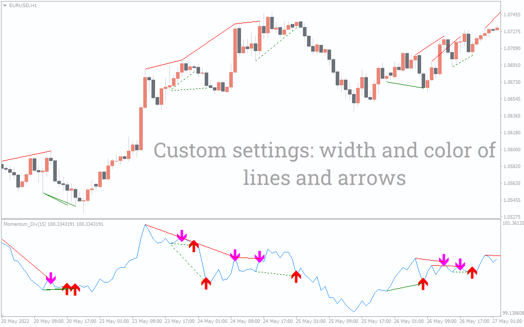 The Momentum Divergence draws automatic trend lines in the main chart and indicator window to highlight the potential divergence setup. Besides, it includes green/red arrows to signal the next possible direction of upcoming price movements.