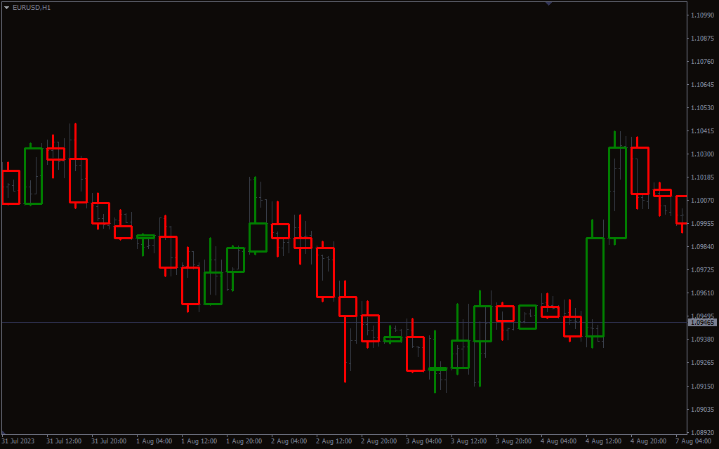 The above image depicts the MTF Candlestick indicator on the H1 timeframe of the EURUSD pair.