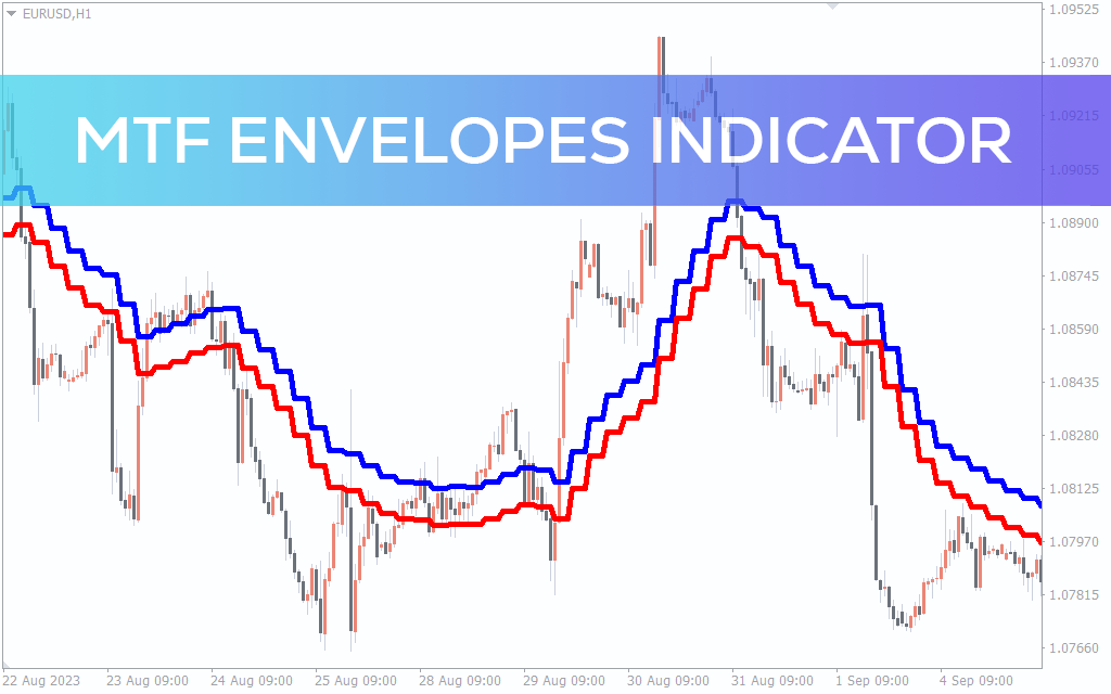 MTF Envelopes Indicator For MT4 plots channel lines that provide bullish and bearish forex trading signals based on price and channel line crossover