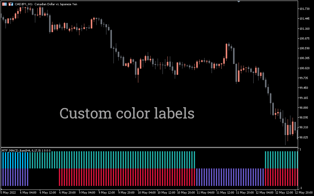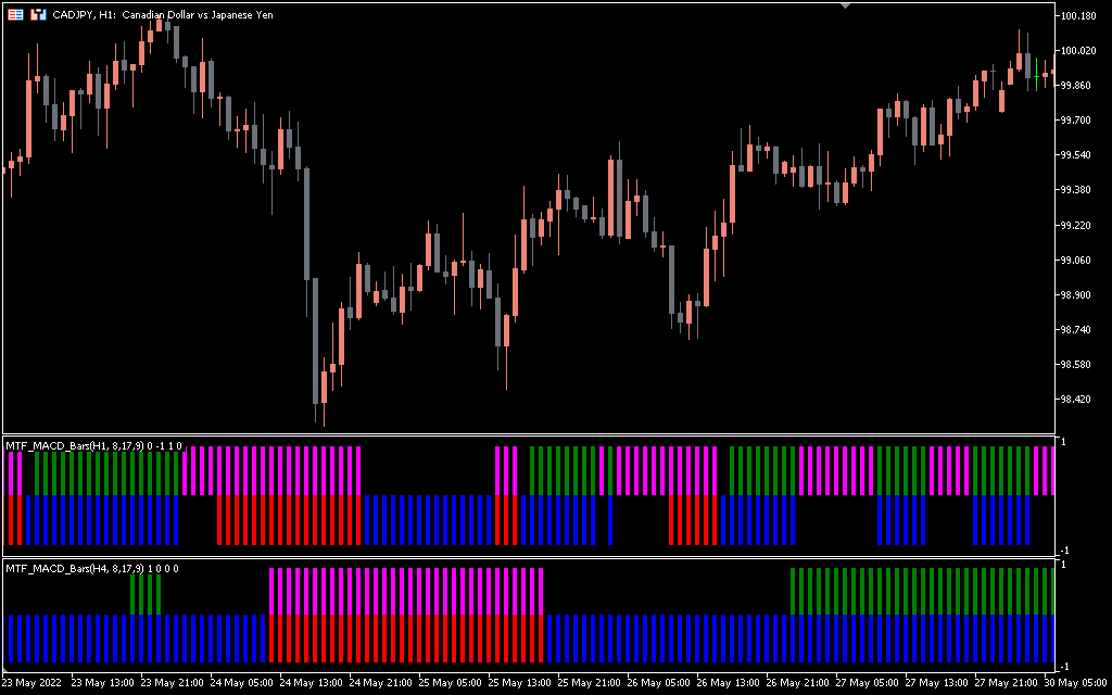 Many Forex traders are used by the convergence and divergence indicator or the MACD indicator. The MACD indicator is considered reliable traders, stock traders and other financial instruments traders. The MTF MACD indicator can also display the valuation divergence values ​​in higher or lower time frames in the current indicator window. This provides both new and experienced forex and stock traders best understand the trend available in higher time frames. The CADJPY H4 MT5 diagram shows the MTF MACD Bars Indicator, marked with possible purchase and sales signals . The above diagram shows the MACD signals from the current period.
