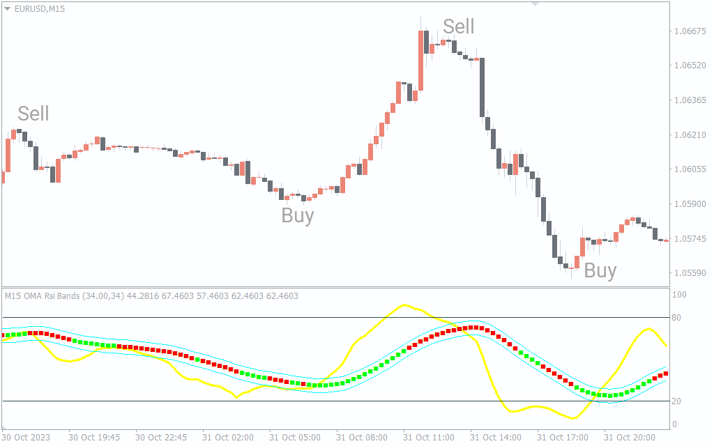 The indicator plots yellow RSI line and blue moving average band with green bullish dots and red bearish ones. In fact, the trading strategy is to enter the markets based on the crossover of the RSI and bands.