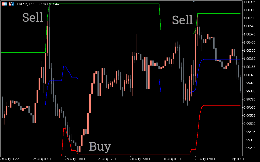 A sustained breakout of the upper price channel indicates a breakout of the channel and gives a BUY signal. Forex traders can place a stop loss in the lower channel with take profit levels at a good risk/reward ratio. Alternatively, a SELL is guaranteed if the lower price channel is broken. The best stop loss for this technical trading strategy is on the upper channel.