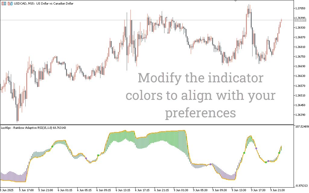 This tool is particularly valuable for intraday traders, scalpers, and swing traders who need fast insights into the market’s internal pressure. Whether you’re trading currencies, indices, or crypto assets, the Rainbow Adaptive RSI offers a fresh, intuitive alternative to classic oscillators.