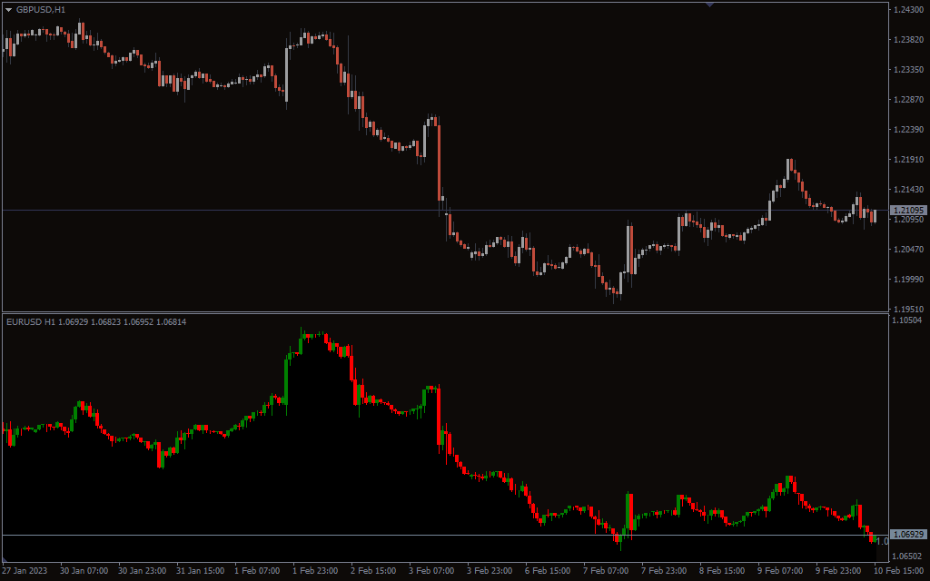 The above GBPUSD H1 price chart shows the second chart indicator for MT4 in action. The indicator has added the EURUSD H1 chart which is shown below the GBPUSD chart.