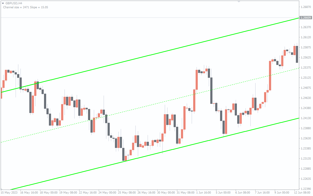 The above GBP/USD H4 chart shows the indicator on the chart.  You can analyze the slope and direction of the channel to determine the prevailing trend. An upward-sloping channel suggests an uptrend, while a downward-sloping channel indicates a downtrend.