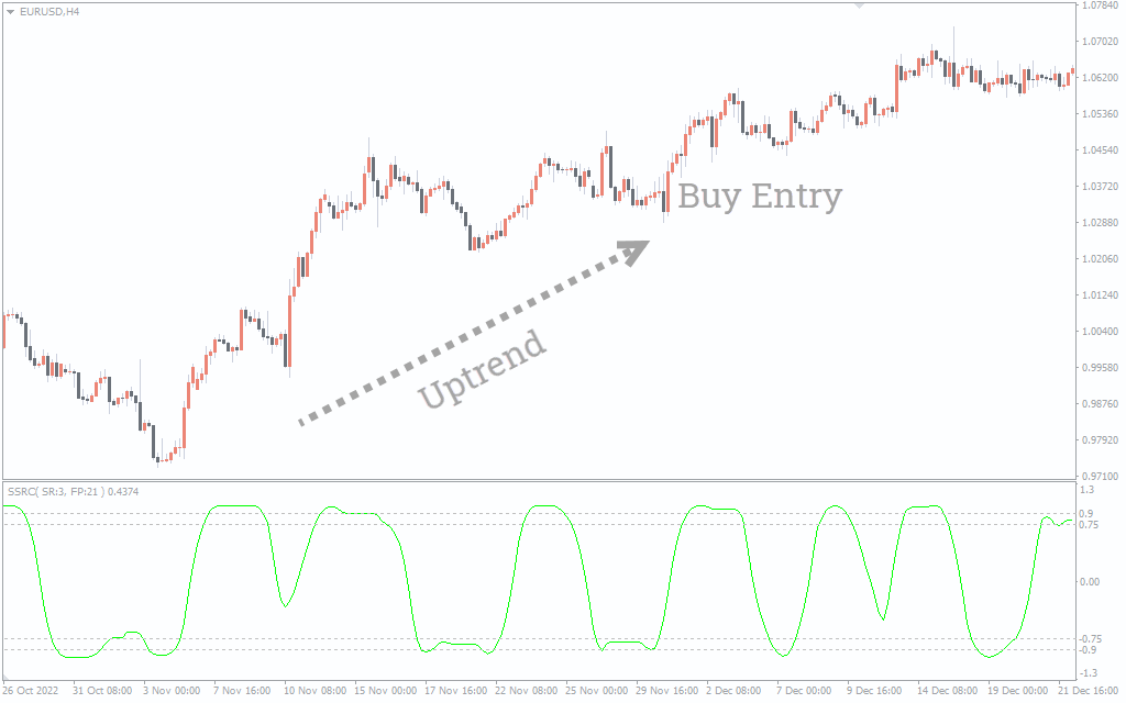 Firstly, the image shows that the EURUSD pair is trending to the upside. Secondly, the market retraced to the oversold zone of the indicator, which indicates a potential trend reversal for a bullish continuation. Furthermore, the indicator’s line also crossed above the zero line, signaling a bullish bias. Finally, the price printed a bullish candlestick pattern, a confluence to open a buy position.