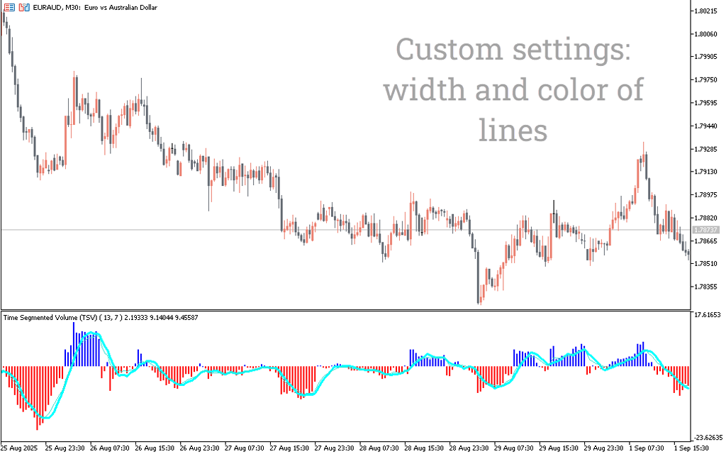 TSV works as an oscillator with a histogram plotted around the zero line. When the histogram rises above zero and continues to climb, it indicates increasing bullish volume pressure, signaling that buyers are stepping in and supporting the move. This often aligns with breakouts or strong impulsive waves. Conversely, when the histogram falls below zero, it suggests that sellers dominate the market, creating downward momentum.