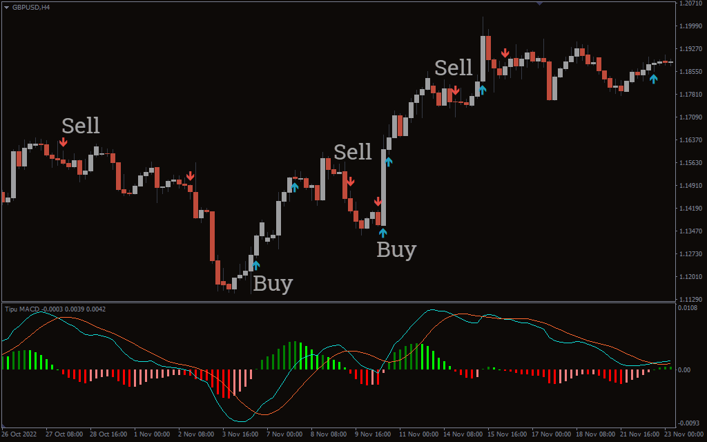 Tipu MACD Indicator For MT4 provides visual alerts and buy and sell forex trading signals based on the classic MACD indicator.