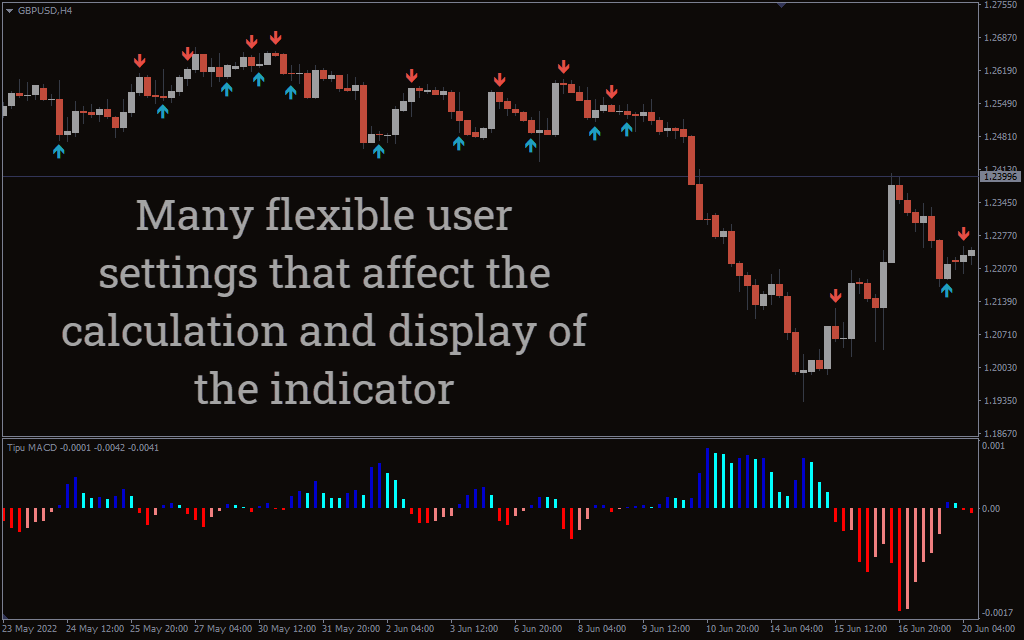 The above GBPUSD H4 candlestick price chart shows the Tipu MACD indicator for MT4 in action. Generally, the indicator displays the MACD as a separate window. In fact, traders can use this indicator similar to the classic MACD indicator.