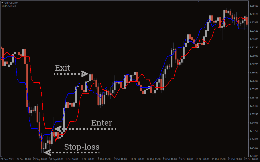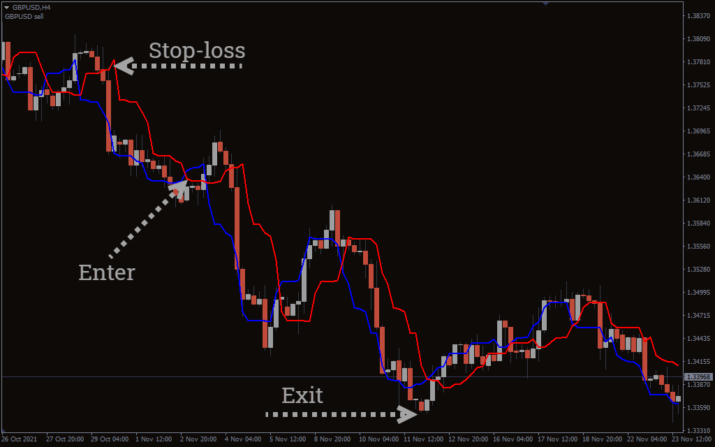 - Exit the trade when the red line goes below the blue line.