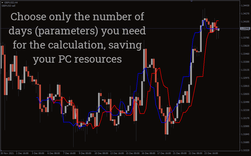 The red line indicates bears are winning and presents a sell signal. Conversely, the blue line repaints bulls are winning and mentions a buy signal.