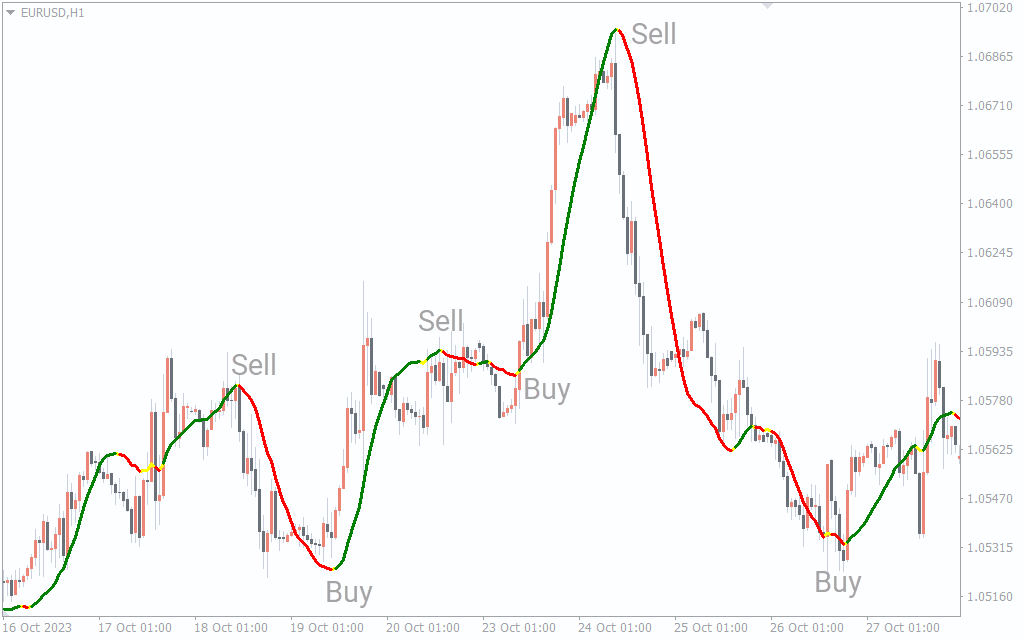 If the indicator changes to green, traders should enter the markets with a buy trade and place a stop loss below the previous swing low. The best strategy to book profits is to ride the trend and exit at yellow or red color change of the indicator line.