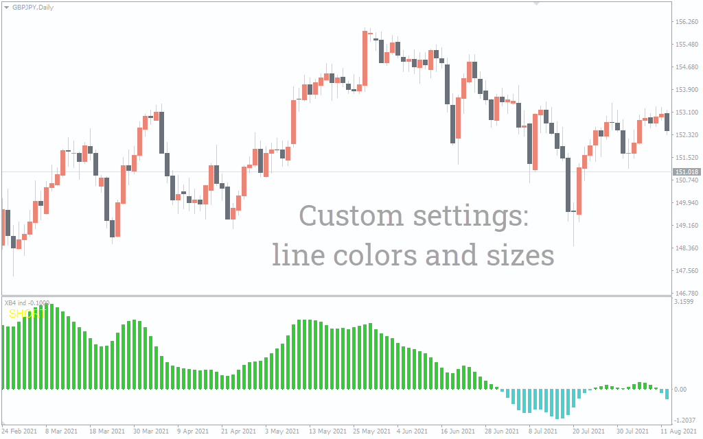 XB4 is pretty much to use and a perfect tool for newbies. Simply take the trade when the histogram changes color from blue to red and vice versa. However, you should combine it with other indicators to confirm the signal.