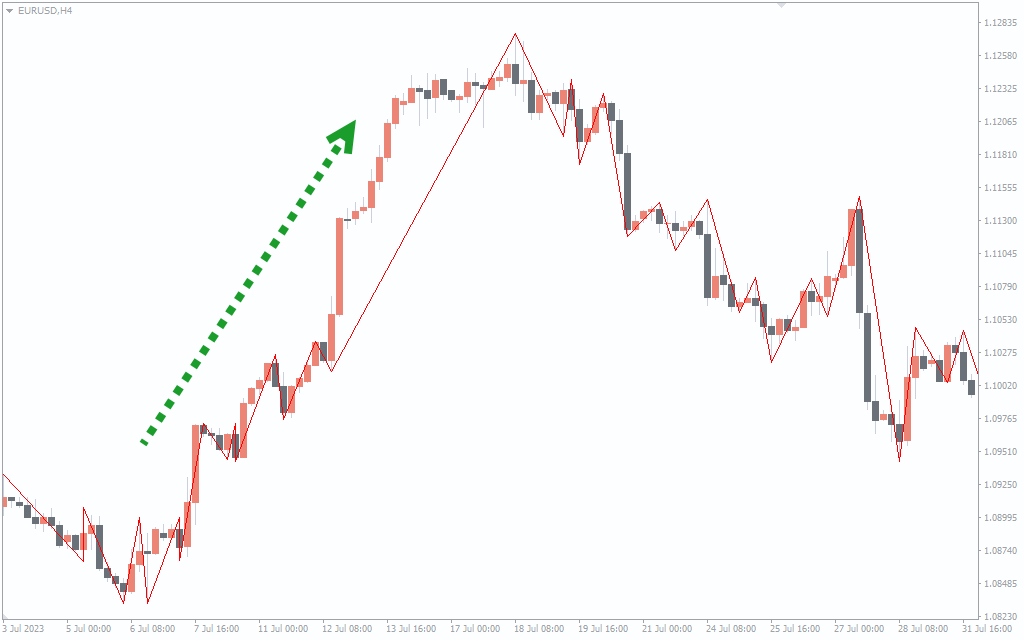 The indicator looks like the traditional ZigZag tool on the MT4 platform but differs in operation. It considers and highlights virtually every peak and trough of the price, which shows the trend direction of the market and the potential reversal zones.