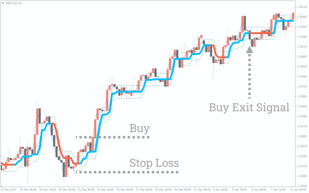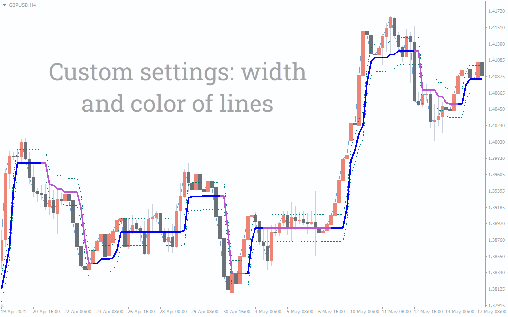 The bold line across the price chart works as a dynamic trendline. The indicator turns blue, and the price treats the trendline as support during a bullish market trend. When the price breaks below the support, the indicator level turns red to signal a bearish trend.