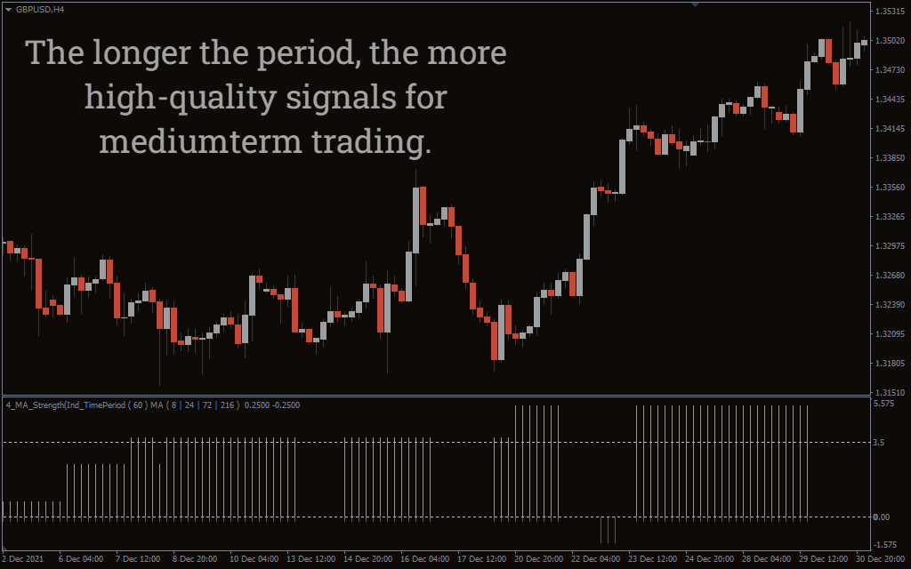 The above GBP/USD H4 chart shows BUY and SELL signals with the indicator. The 4-MA Strength Indicator indicates the bearish and bullish trend by plotting bars below the chart.