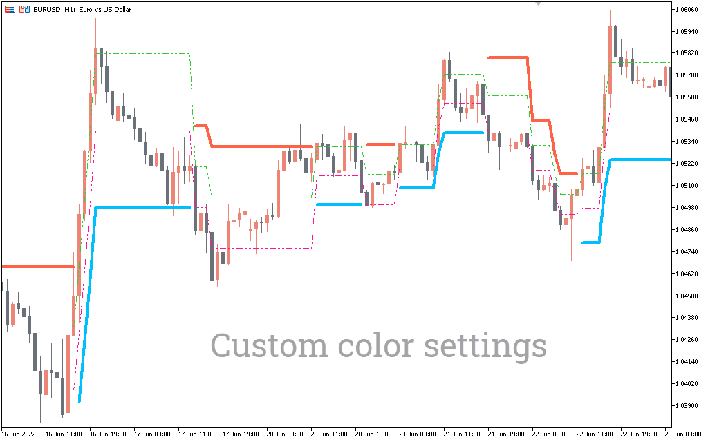 The screenshot above shows how the Adaptive Renko indicator will look on your chart once installed. The indicator comes with two sets of dotted and bold lines (RED and GREEN). Dashed lines are used to measure channel fluctuations. Thick lines, on the other hand, serve as support/resistance levels and BUY/SELL signals.