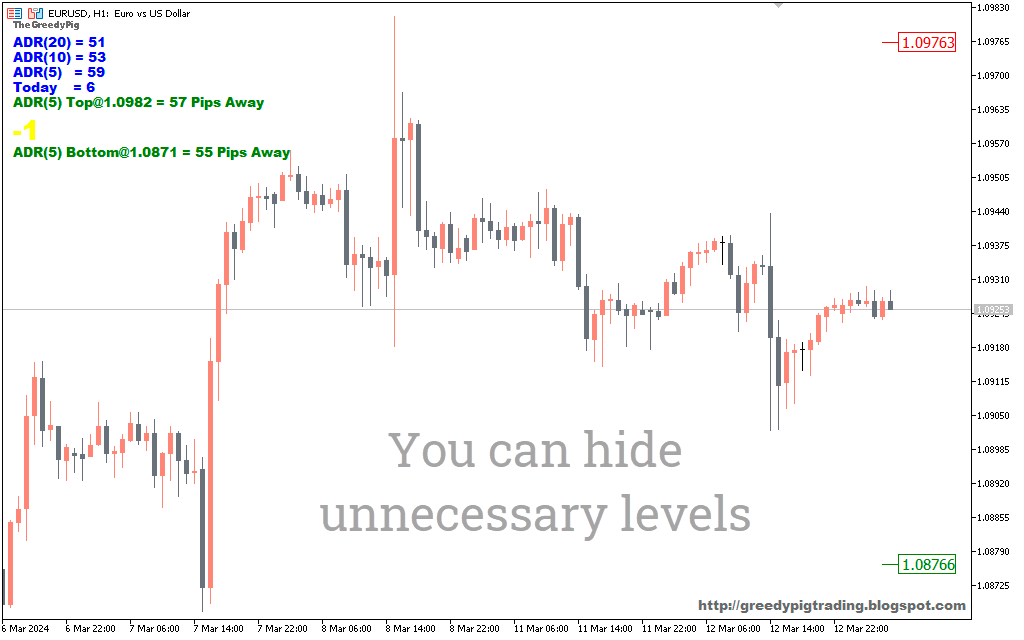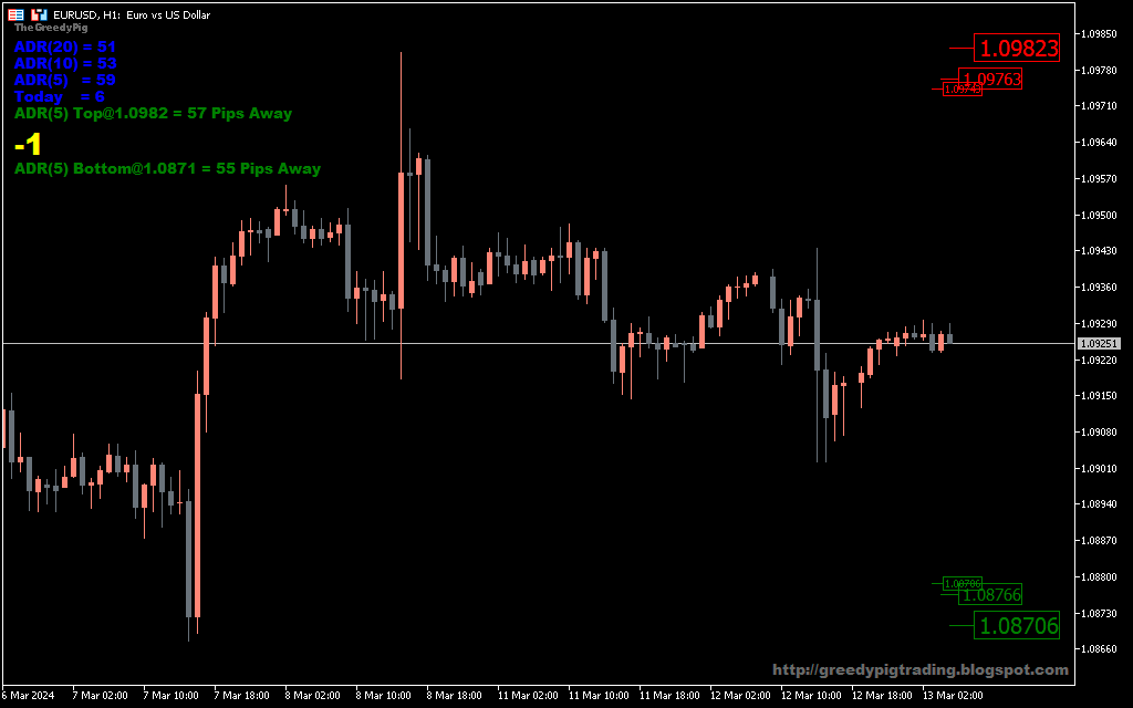 The images above show the price movement of the Euro against the US Dollar over one hour. According to the indicator, the average range for 20 days is 51 points. Similarly, the 10-day ADR is 53 pips and the 5-day ADR is 59 pips. According to the indicator, the current daily price range is 6 points. Likewise, the indicators show that price is 56 pips away from hitting the projected top and 56 pips away from the bottom based on the 5-day ATR.