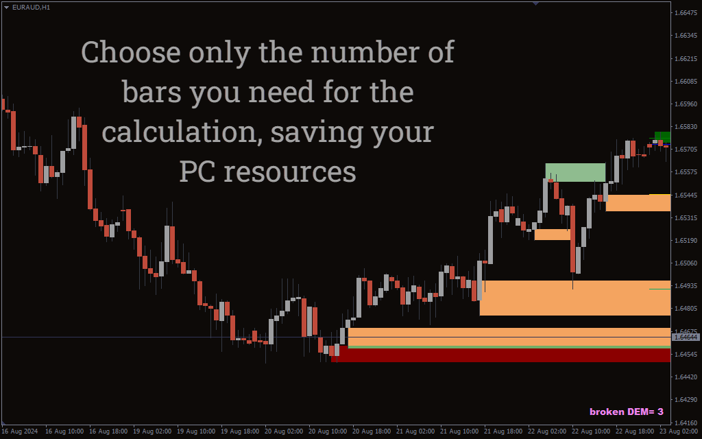 The indicator also includes several customizable settings, allowing traders to fine-tune the zone detection based on their specific trading style and the market conditions.