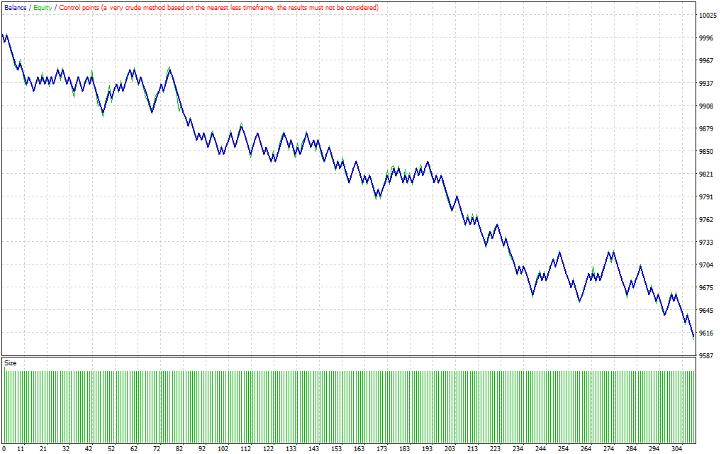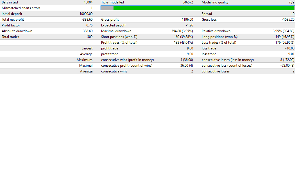 The profit factor of 0.75 and expected payoff of -1.26 confirm that the system is not profitable in its current configuration. The strategy executed 309 trades, which provides a decent statistical sample, making the results more reliable.