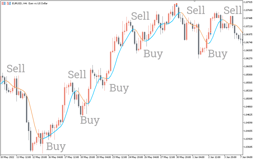 The above EURUSD H4 price chart shows the Alma for MT5 indicator in action. The indicator draws the Alma line on the price chart as a continuous blue line. The name of the Alma indicator comes from the name of the developer Arno Legus. The main problem for technical traders using moving averages is the lagging nature of the indicator. In other words, moving averages with shorter periods tend to be aggressive and give false signals, while longer ones give signals for late entry. However, the Alma indicator solves these problems.