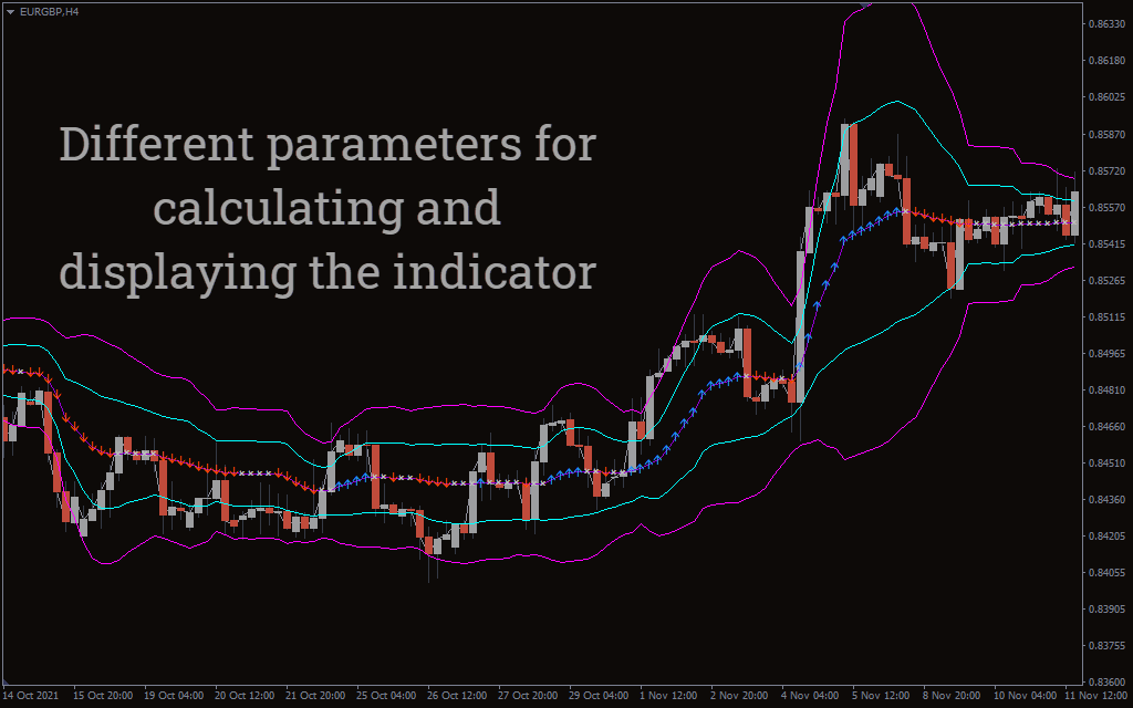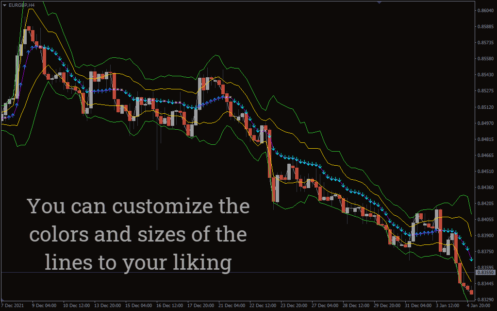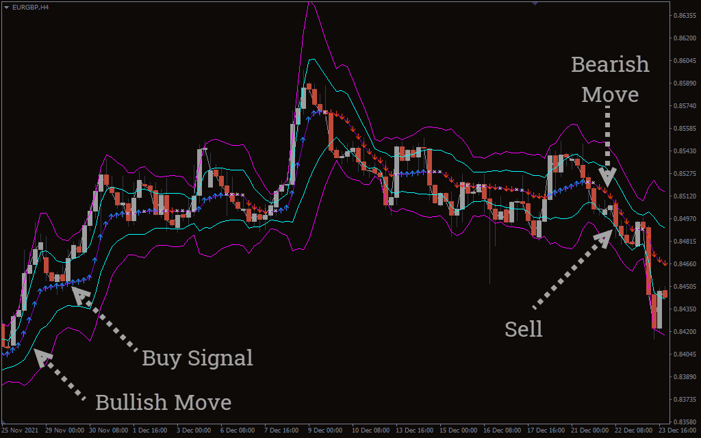 The indicator is designed with signal arrows and a band of moving averages that encloses the movement of the entire price. The expansion/contraction of the outer bands of the moving averages act as a gauge to measure the increase/decrease of the market’s volatility. The bands also act as some form of dynamic support and resistance.