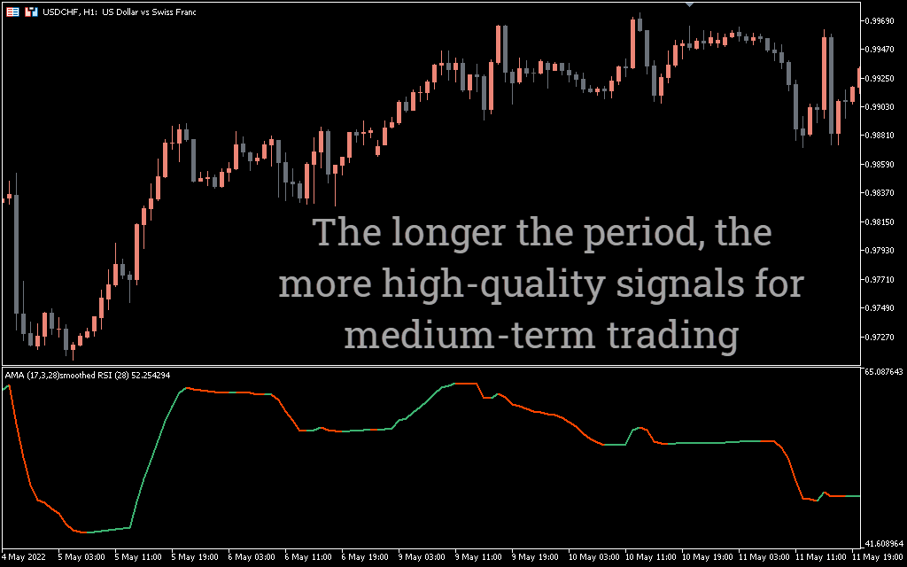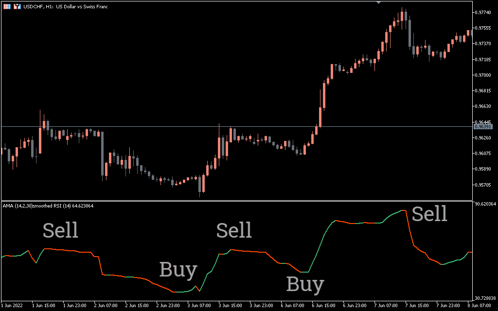 As mentioned earlier, the AMA Smoothed RSI indicator for MT5 is a signal line that indicates the direction of the trend. To use the indicator, you need to remember the traditional RSI settings.