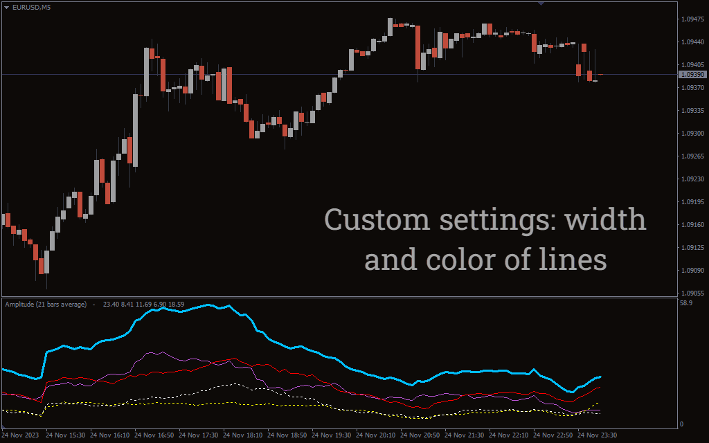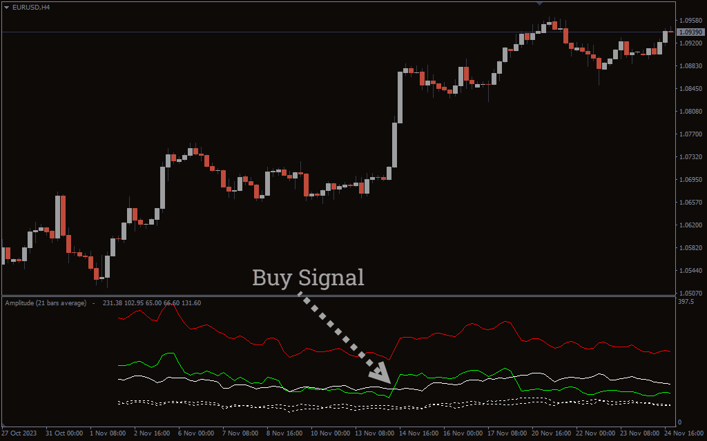 The above image shows the market analysis of the Amplitude Short indicator on the EUR/USD currency pair. The red amplitude line indicates an increase/decrease in bullish and bearish volatility, while the green and white amplitude lines signal the trend reversal/direction of the market.