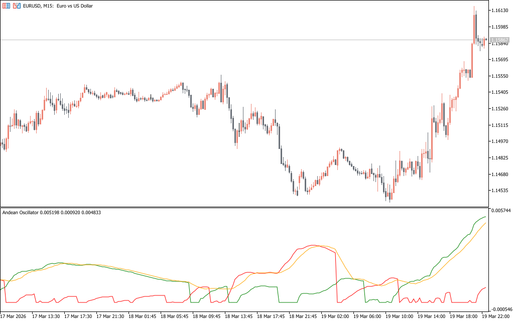 In practical trading context, this is highly valuable. Markets rarely move in clean, predictable trends. There are always phases of accumulation, distribution, and temporary pullbacks. The Andean Oscillator aids in filtering through noise and indicates when momentum is really changing.