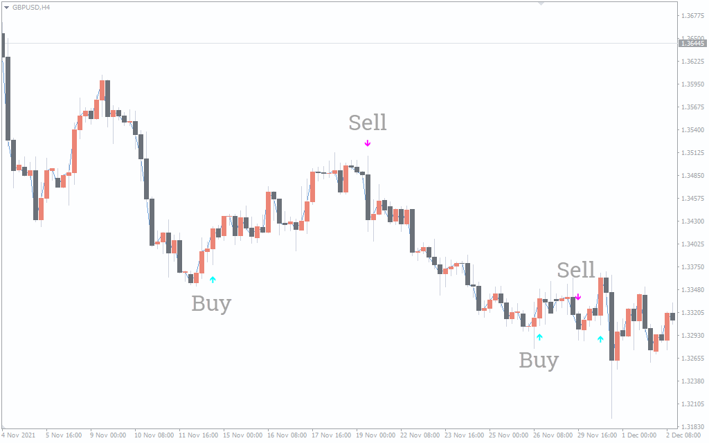 The above GBP/USD chart H4 shows the BUY and SELL signals based on price momentum. In addition, the indicator plots red and blue arrows to identify market reversals.
