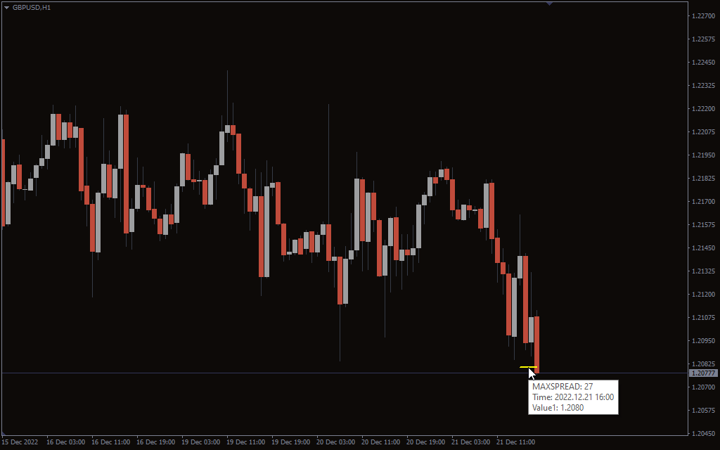 To identify the maximum spread of the currency pair, traders should hover the mouse over the line. Traders should note that the maximum spread mentioned is calculated from the moment the indicator is placed on the price chart.