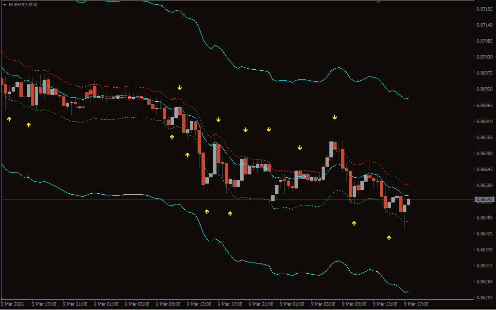 The Bands Sniper indicator provides a graphic representation of these extremes, making it easy to spot any potential reversal without cluttering the chart. The indicator not only shows the bands but directional arrows when specific conditions are met to help traders identify moments when the probability of a pullback or reversal increases.
