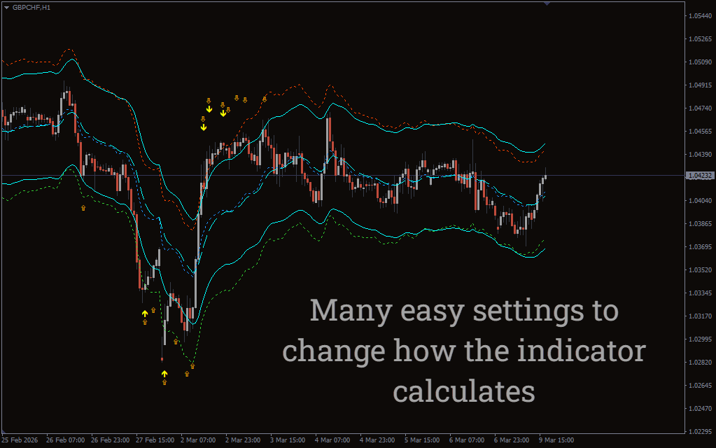 Bands Sniper creates trading signals using price interactions with the outer volatility bands. If price moves aggressively toward the upper band and momentum begins to weaken, the indicator will print a sell arrow indicating a possible downward correction. On the opposite side, if the price drops toward the lower band and begins to stabilize, a buy arrow will appear indicating a potential upward reversal.