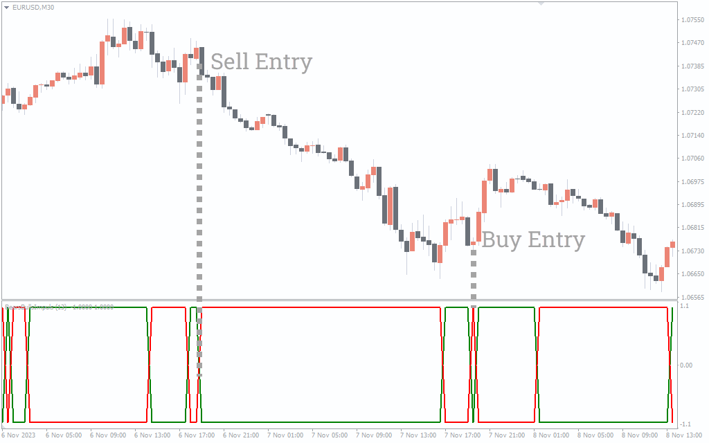 Buy and sell signals are generated when the green and red lines cross over. So, the green line (bull power) above the red line (bear power) indicates a strengthening bullish market sentiment, suggesting an opportunity to buy an instrument. Conversely, the green line below the red line indicates a strengthening bearish sentiment, suggesting an opportunity to sell an asset.