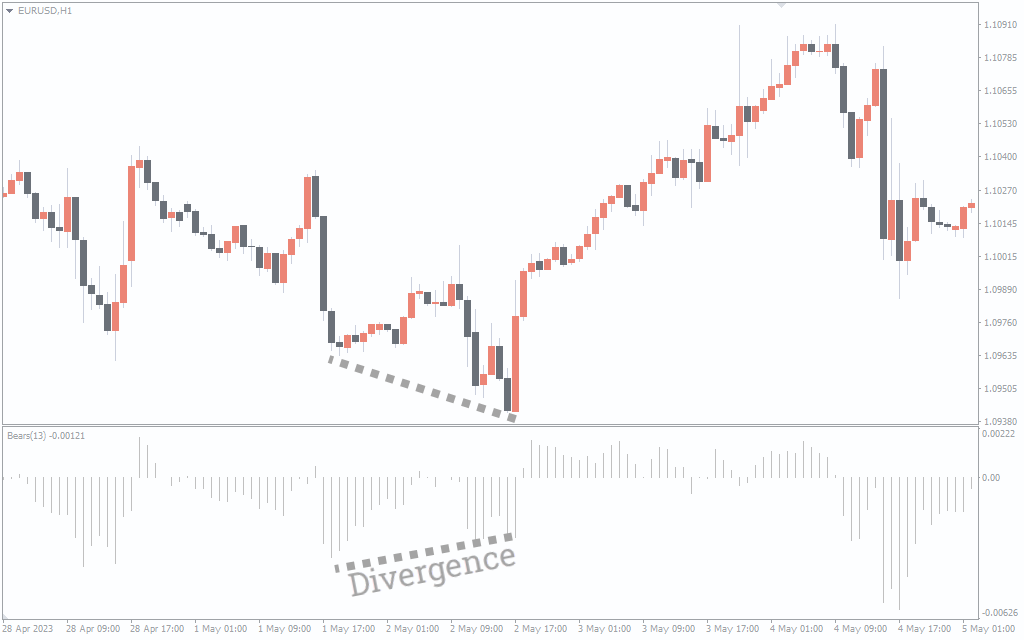 The above image depicts the action of the Bears indicator on the EURUSD in the H1 timeframe. A thing to note about this indicator is that it doesn’t generate buy or sell signals. Thus, it is essentially a technical guide that tells you when to enter or exit the market based on the activities of the bears.