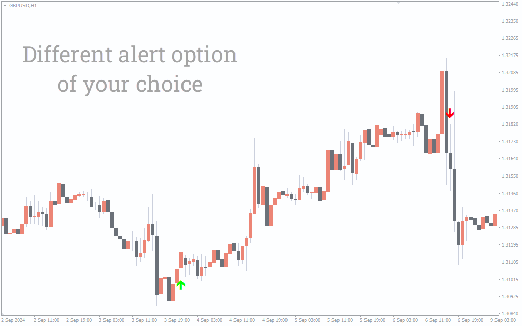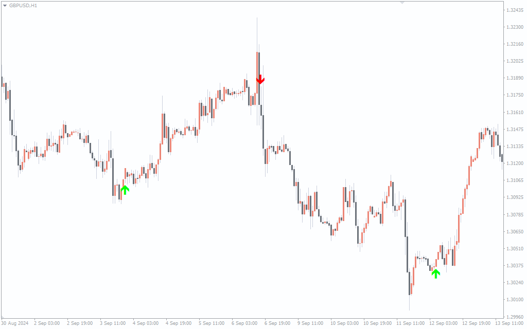 - Red arrows signal a potential sell opportunity, indicating that the market is overbought and a downward reversal might occur.